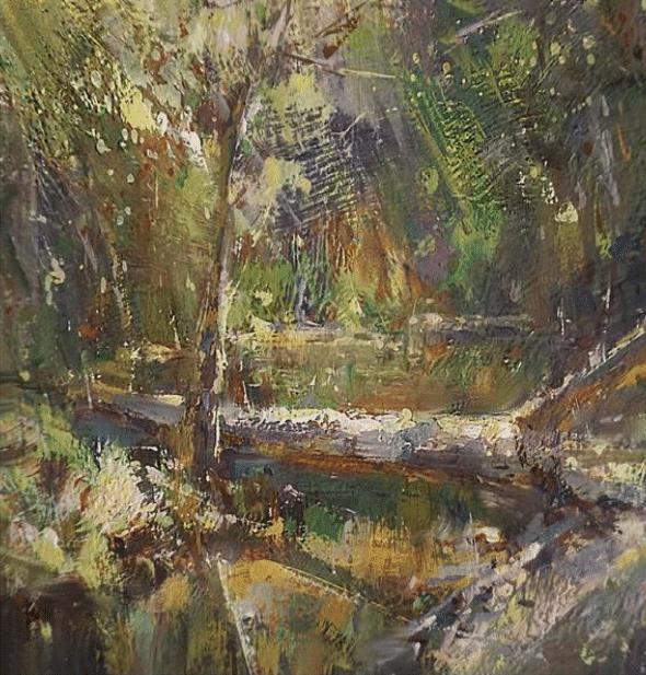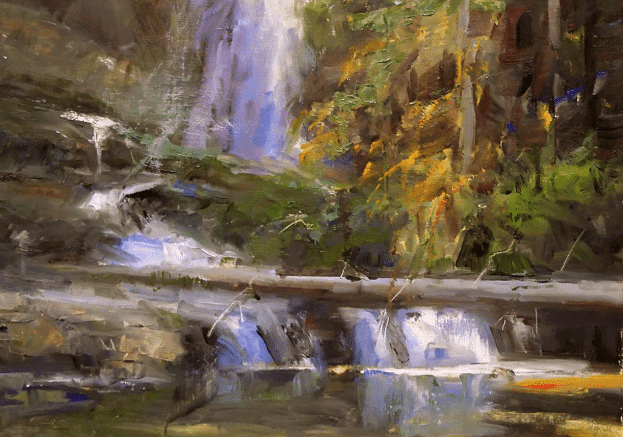 Howard Friedland, “Virgina Falls Revisited” (detail). Friedland, whose method is not that different from Charles Hawthorne’s vibrant “spots of color” approach, has a video on painting waterfalls.