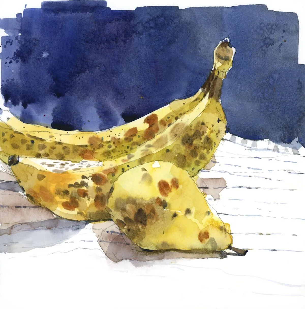 One day, I bought some persimmons and rushed home to arrange them on my drawing table. They were orange, shiny, perfect—and utterly boring. That’s when I noticed a pear, mottled and bruised and left over from yesterday’s lunch bag. And what about those brown bananas, destined for smoothies or some kind of cake? Since decay is always more interesting than perfection, I chose to draw these past-their-prime fruits and then eat the persimmons.