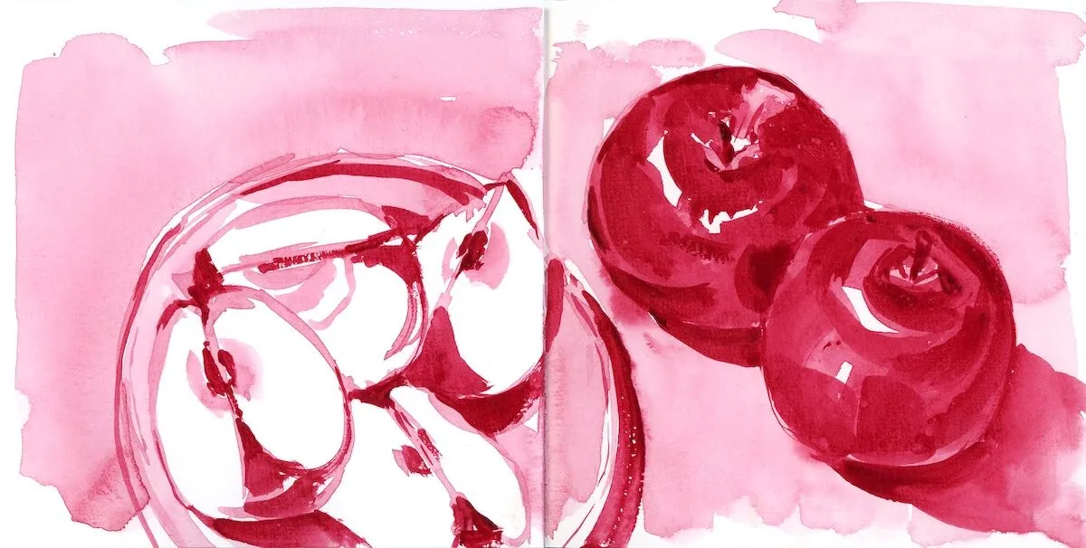 When testing new pigments, I’ll often start with a monochrome sketch. That way, I’m able to see the full range of light-to-dark tones that I can achieve. Here, I paired a tube of carmine watercolor from my paint drawer with some apples from my fruit bowl. I liked the color so much that I gave it a permanent spot in both my studio palette and my travel palette.