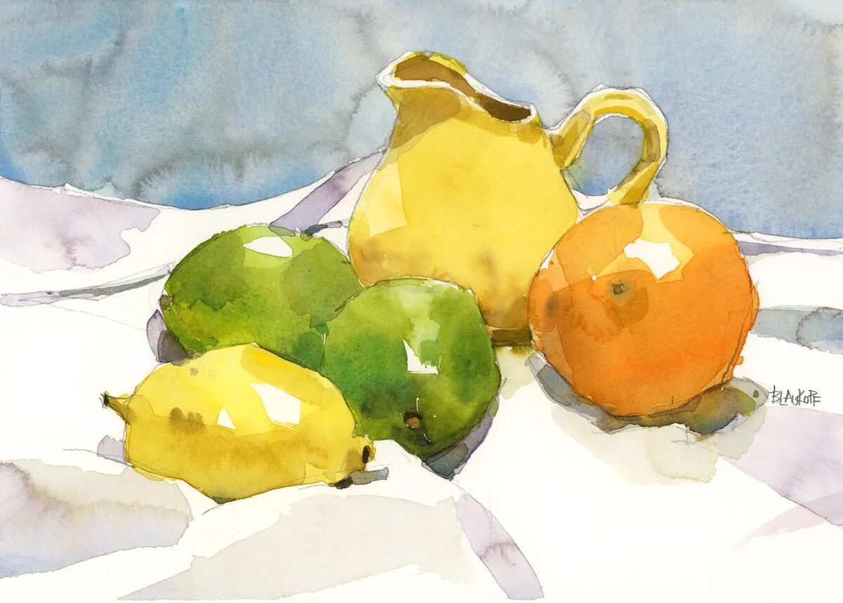 I’m a longtime admirer of the painter Charles Reid, who had an eccentric way of mixing household objects with fruit or flowers—and somehow made it look like everything was just thrown together. He came to mind as I was setting up these citrus fruits, which were all pretty much the same size. Thinking of Reid, I reached for a small yellow creamer to add a bit of height and to echo the bright yellow of the foreground lemon.