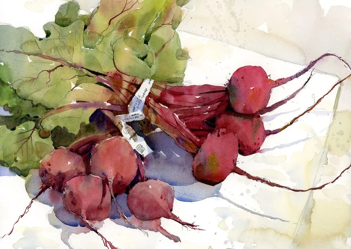 When I go shopping for my studio, I’m also shopping for my kitchen—and vice versa. Sketching and cooking are, after all, both transformative. With their deep red taproots and long spiky tails, beets are one of my favorite subjects. If I can find a bunch with leaves attached, so much the better—for both sketching and cooking. I leave the twist ties on for contrast against the dark, earthy hues. To get that distinctive beet red, I start with alizarin crimson as the main color, to which I add touches of green and yellow, plus some purple for the darkest areas.
