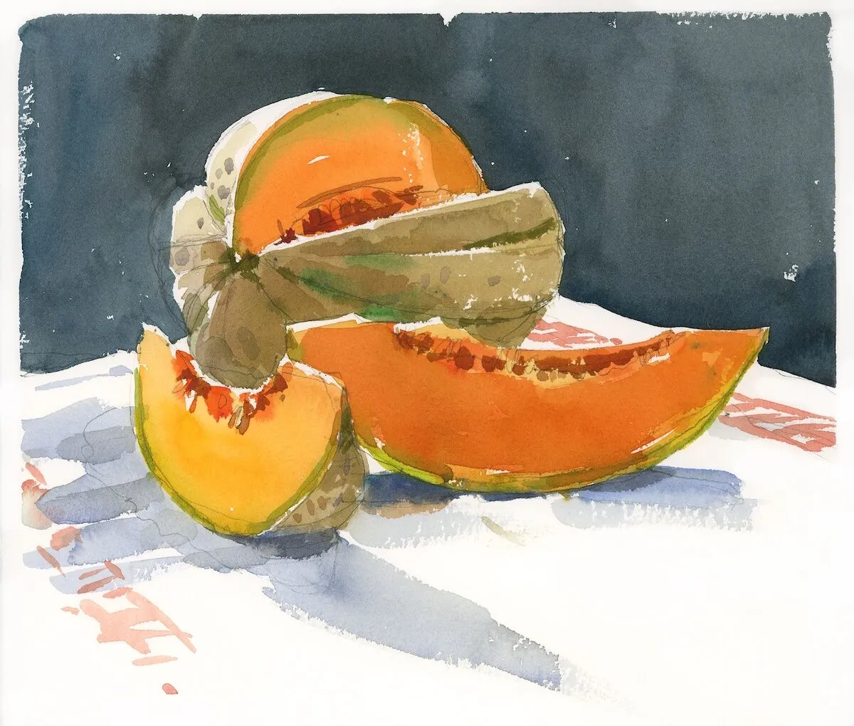 I was partway through cutting up this juicy melon when I realized that I had to paint it, so I set up a cloth and dashed to my studio for paints. To get the right composition, I always walk around my arrangement, sit, then stand, then lean this way and that. I did all these things, and made sure my paints were fresh and juicy in order to capture the deep melon color. I also took some artistic license with the background by creating a deep blue-black wash to offset the bright orange of the ripe fruit.