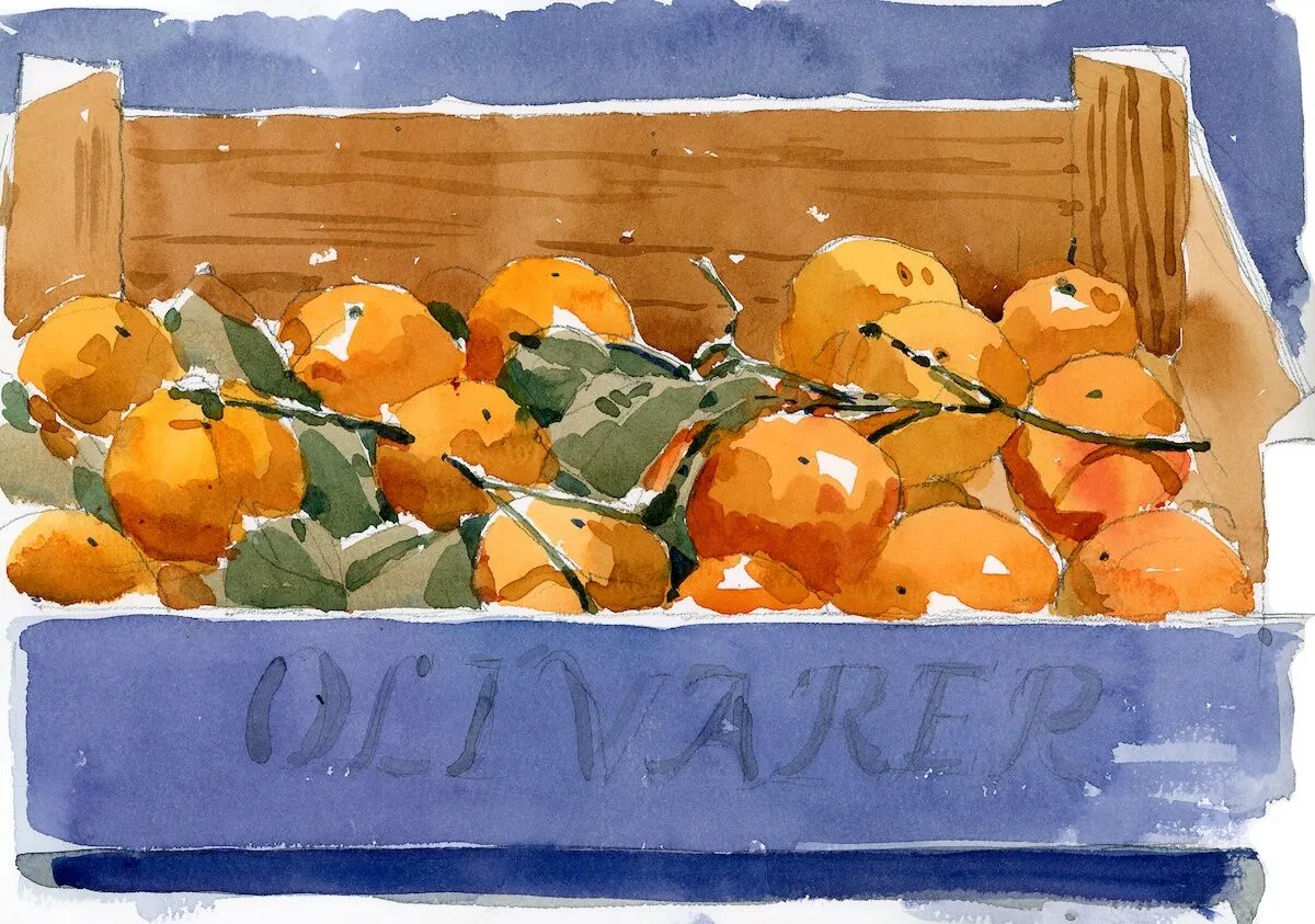 Like pears and apples, clementines show up in my sketchbook a lot. I like them especially with their waxy leaves still attached, which make a great contrast to their pebbly peel. When in season, they’re sold in toylike wooden boxes that are both handsome and useful as a compositional element. When you think about it, how often do you get bright orange, green and purple elements packaged in a tiny wooden crate?